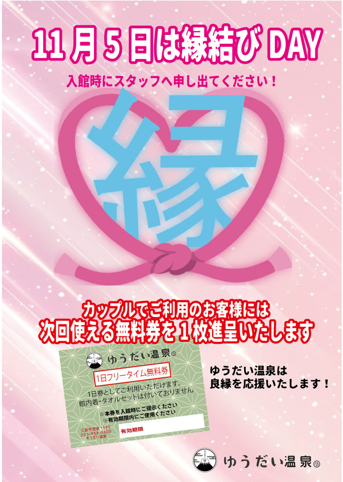 カップルでご利用のお客様に次回利用可能な入館無料券をプレゼントいたします。