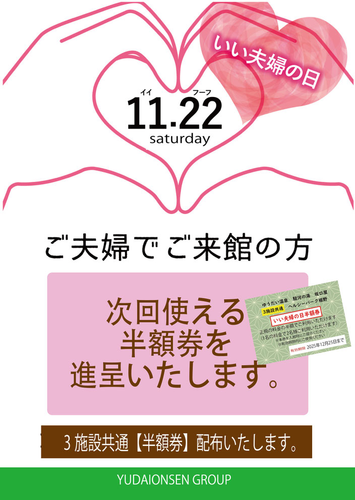 ご夫婦でのご利用で次回利用できる半額券をプレゼントいたします!